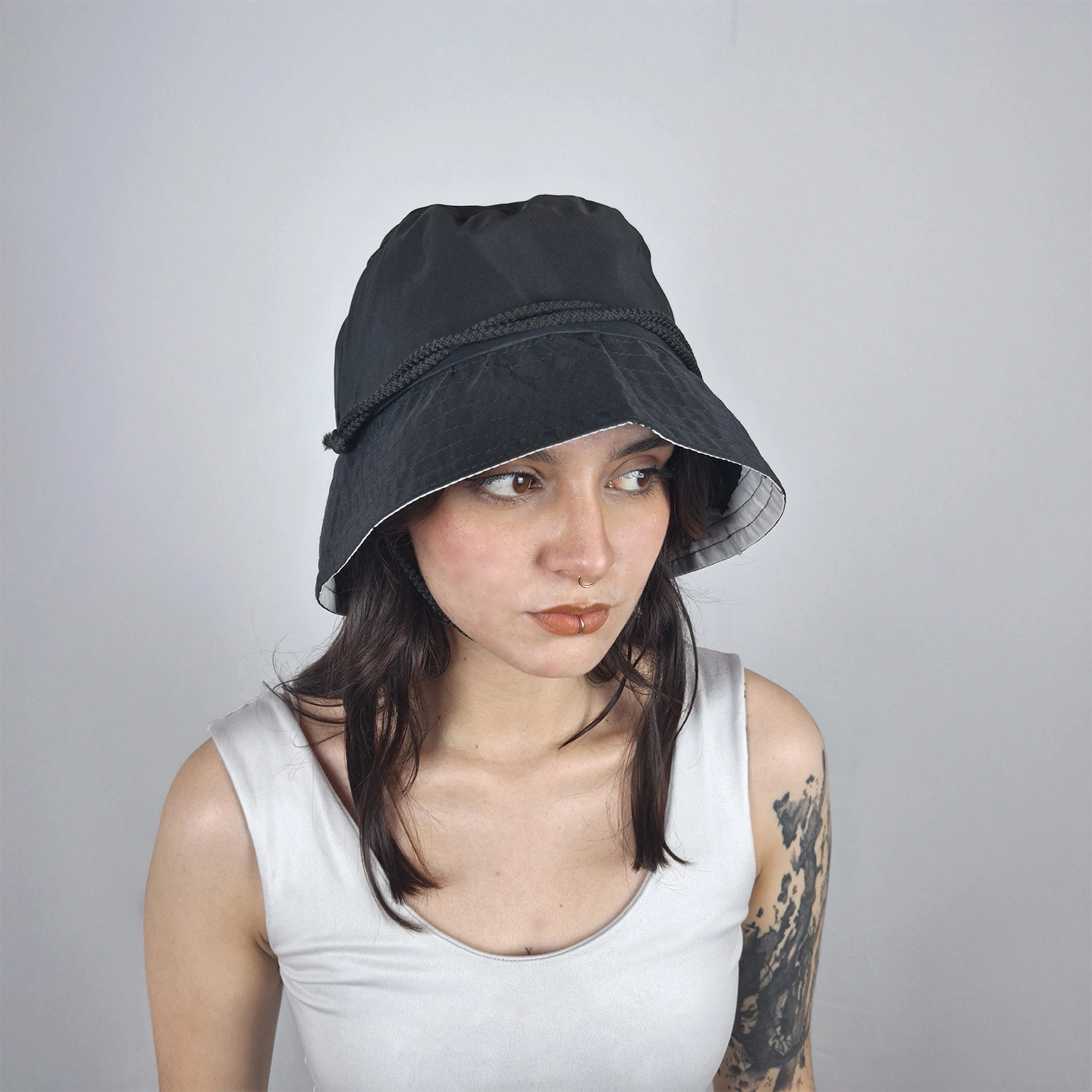 Bucket hat sostenible hecho con tela reciclada de aproximadamente 10 botellas PET. Diseñado por jóvenes creativos colombianos y confeccionado por madres cabeza de hogar. Una prenda sostenible que promueve el cuidado del planeta y el apoyo al talento local.