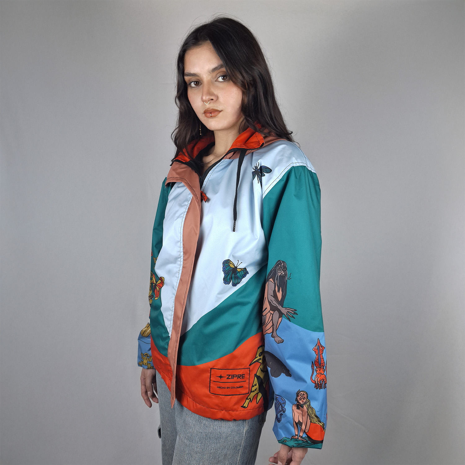 Chaqueta Madre Tierra: Inspirada en mitos colombianos como la Madre Tierra y el Mohán. Con forro, hecha con 70% de botellas PET recicladas. ¡Edición limitada y con historia!