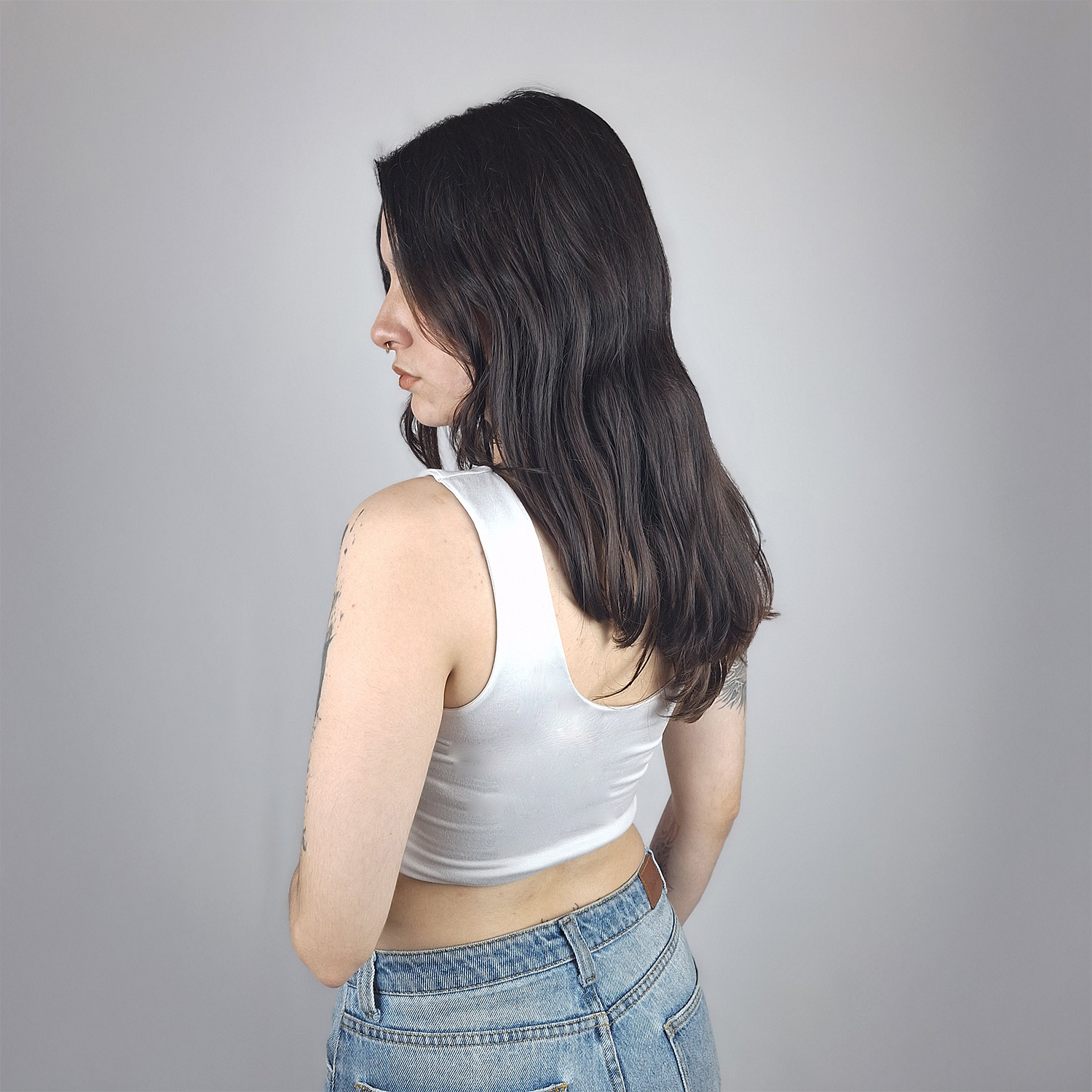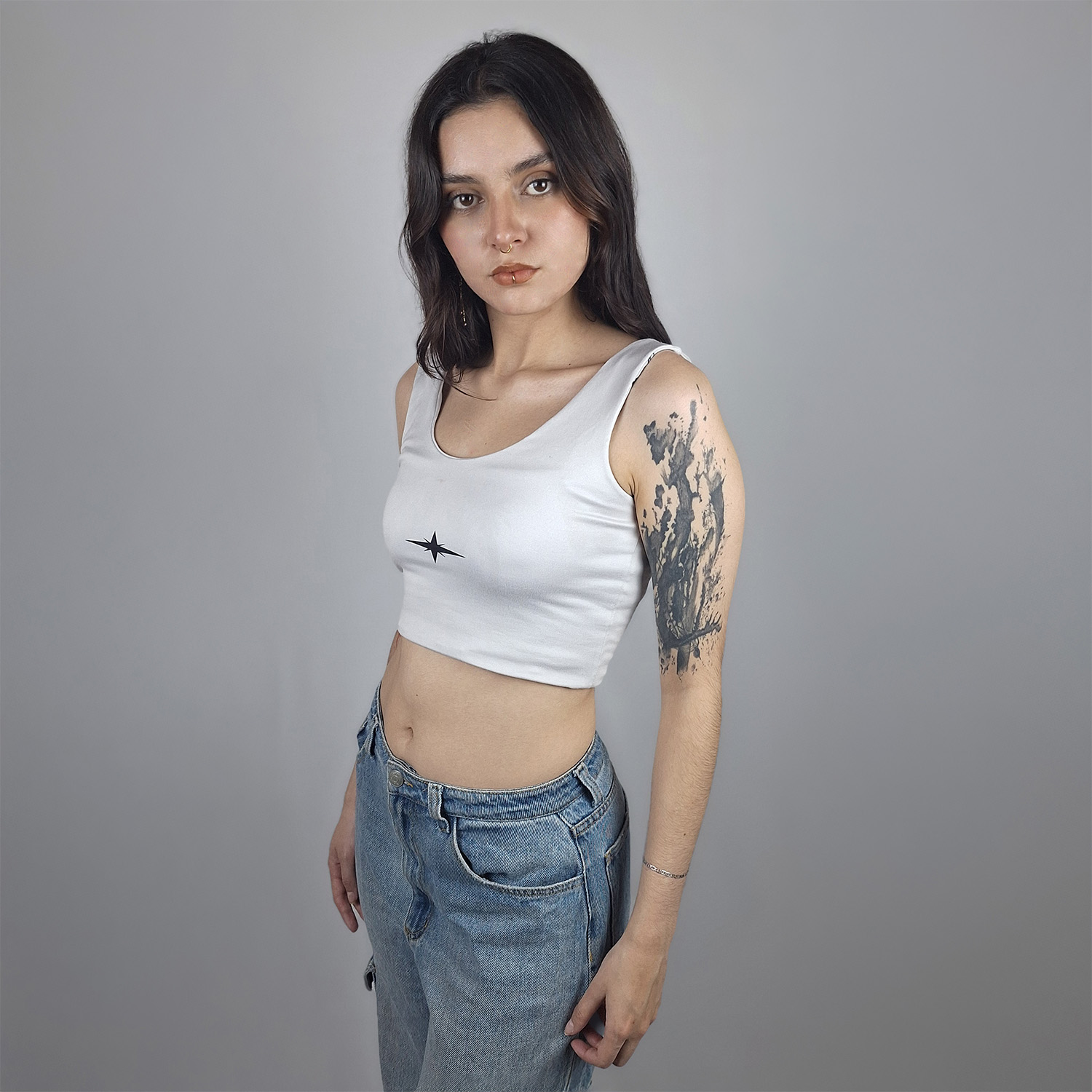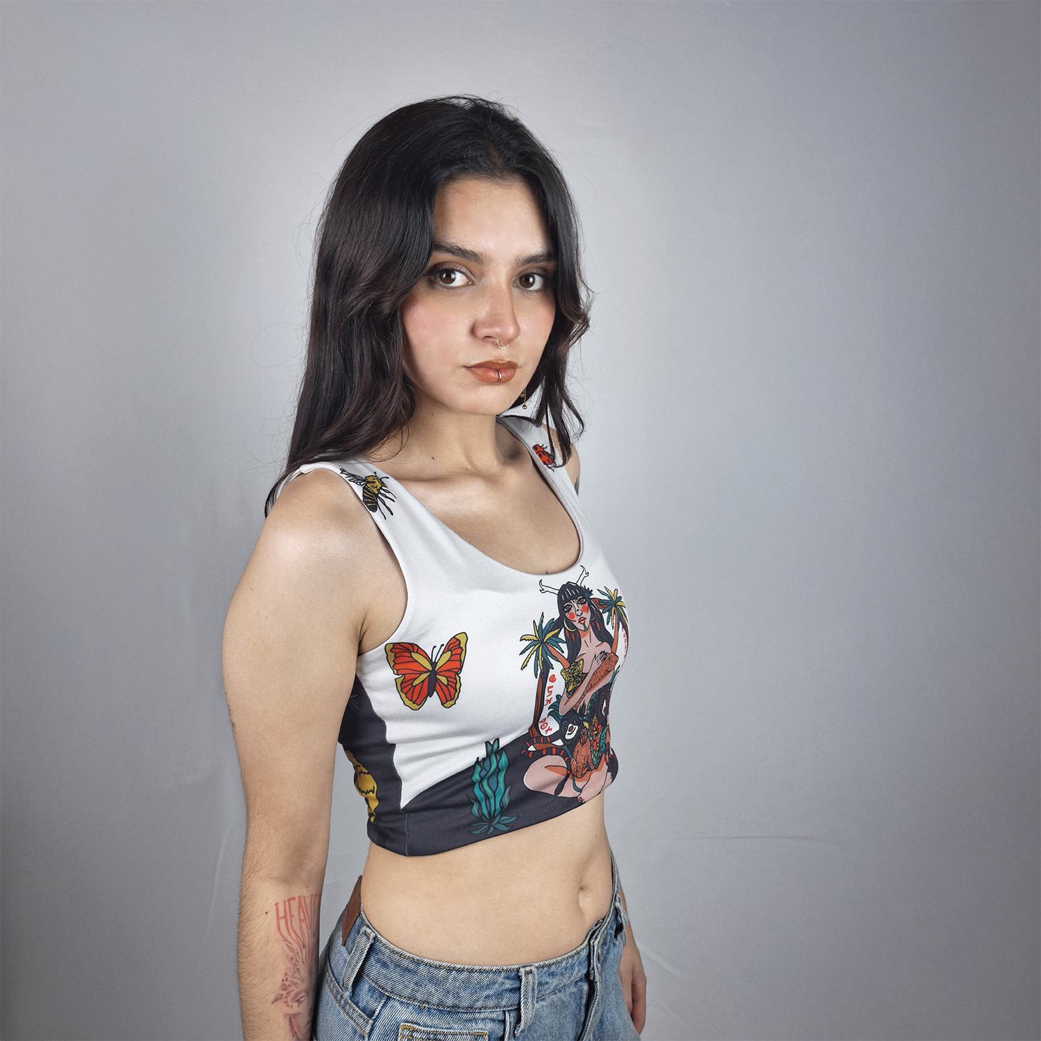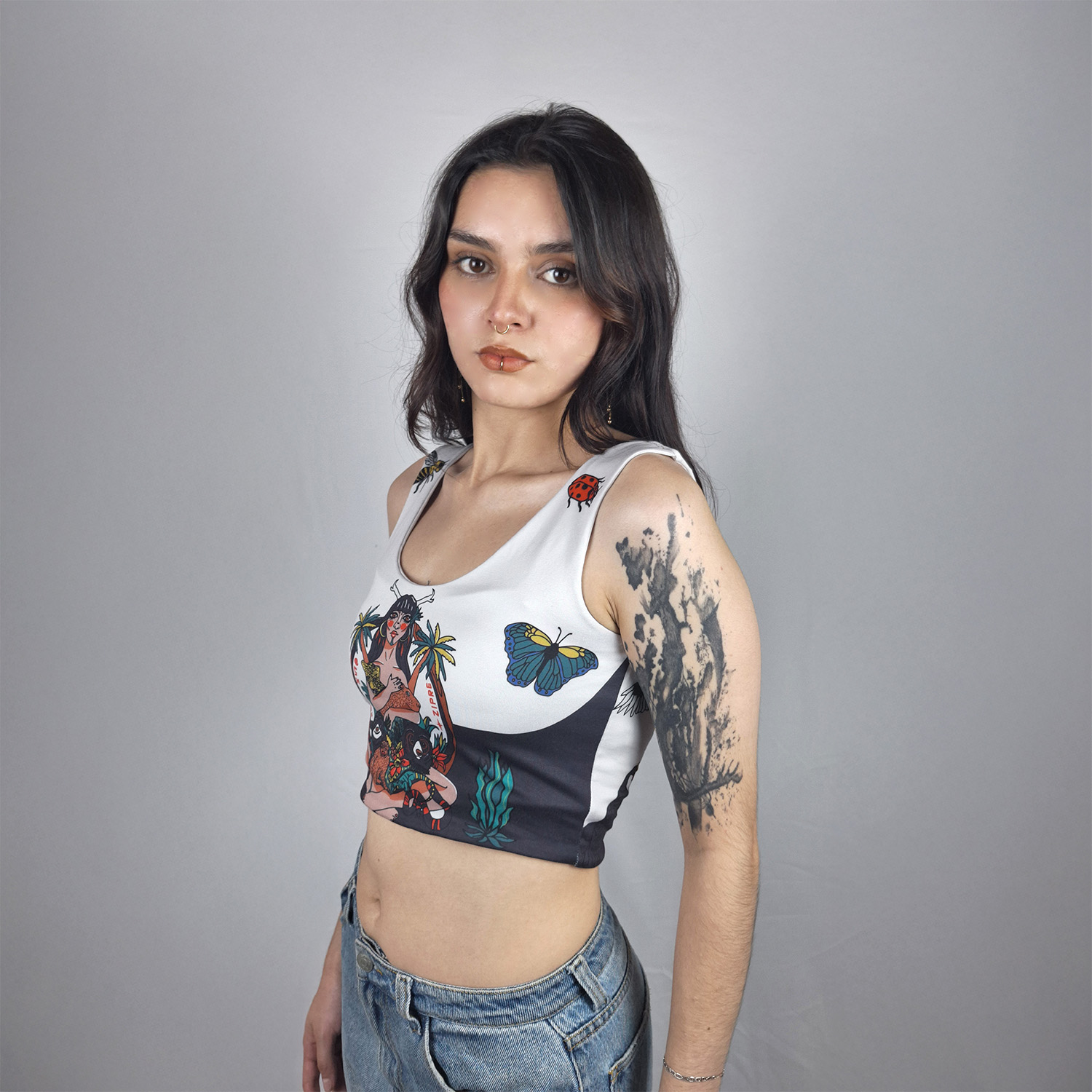Crop Top Eco Sostenible Tierra-Aire: Doble faz con diseño de la Madre Tierra y reverso blanco. Hecho con 48% PET reciclado. Cómodo, versátil y eco-friendly. ¡Edición limitada!