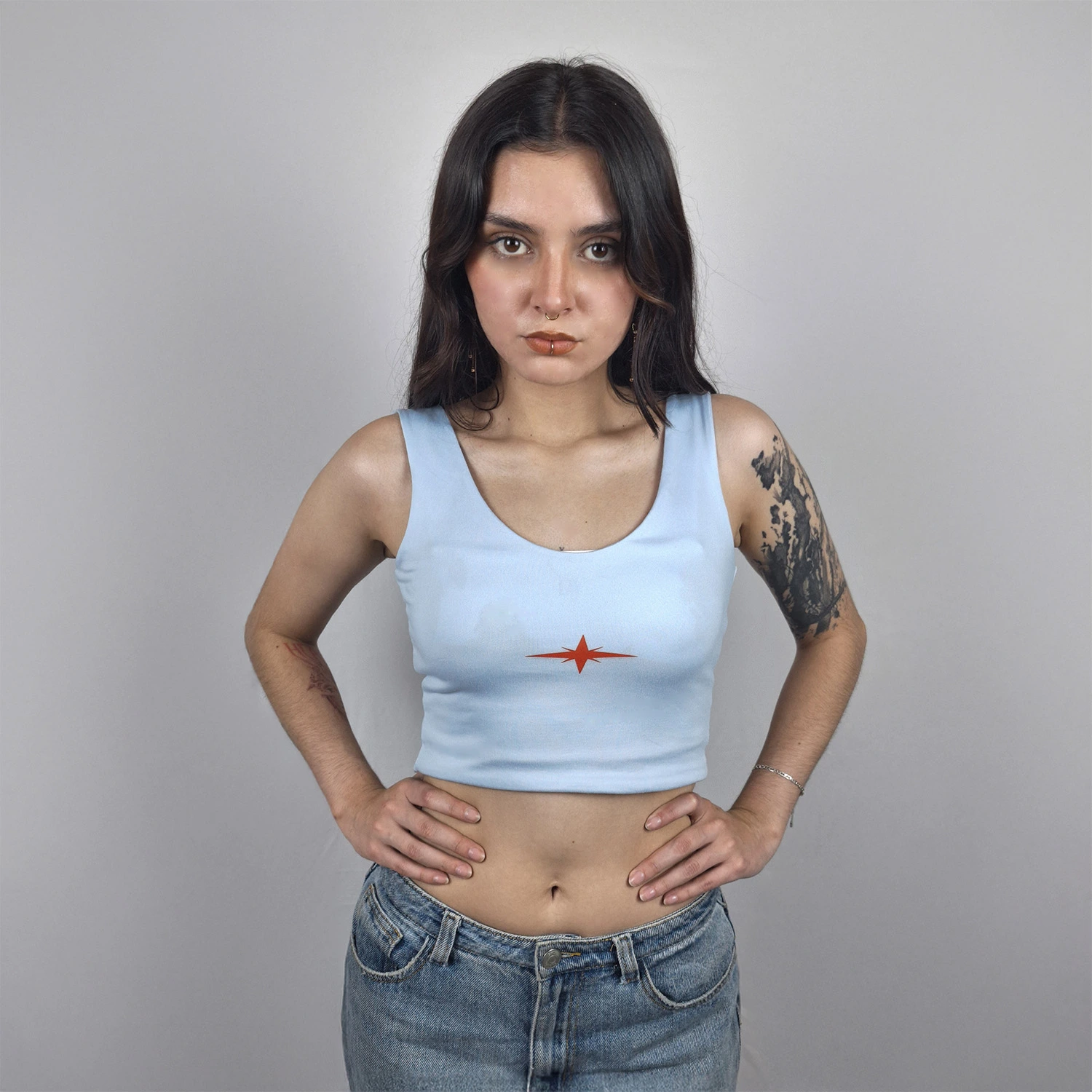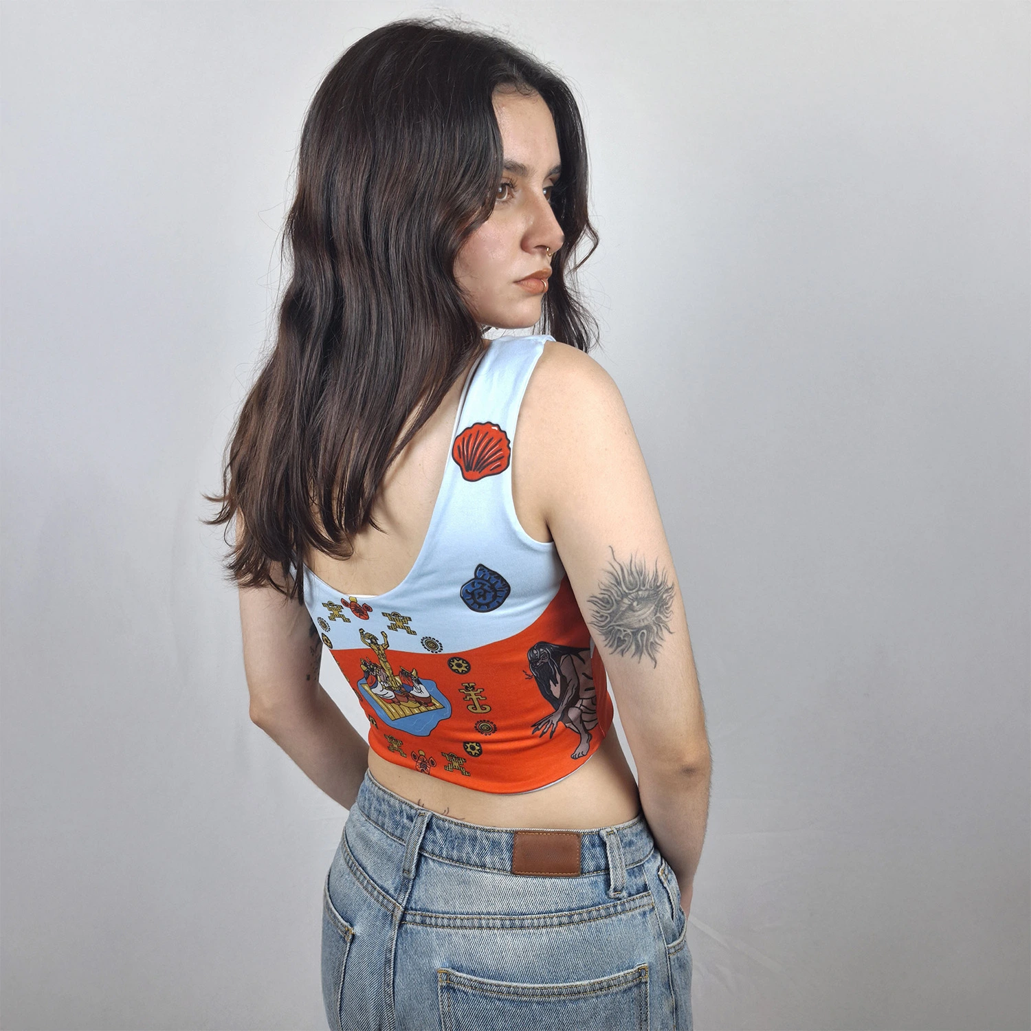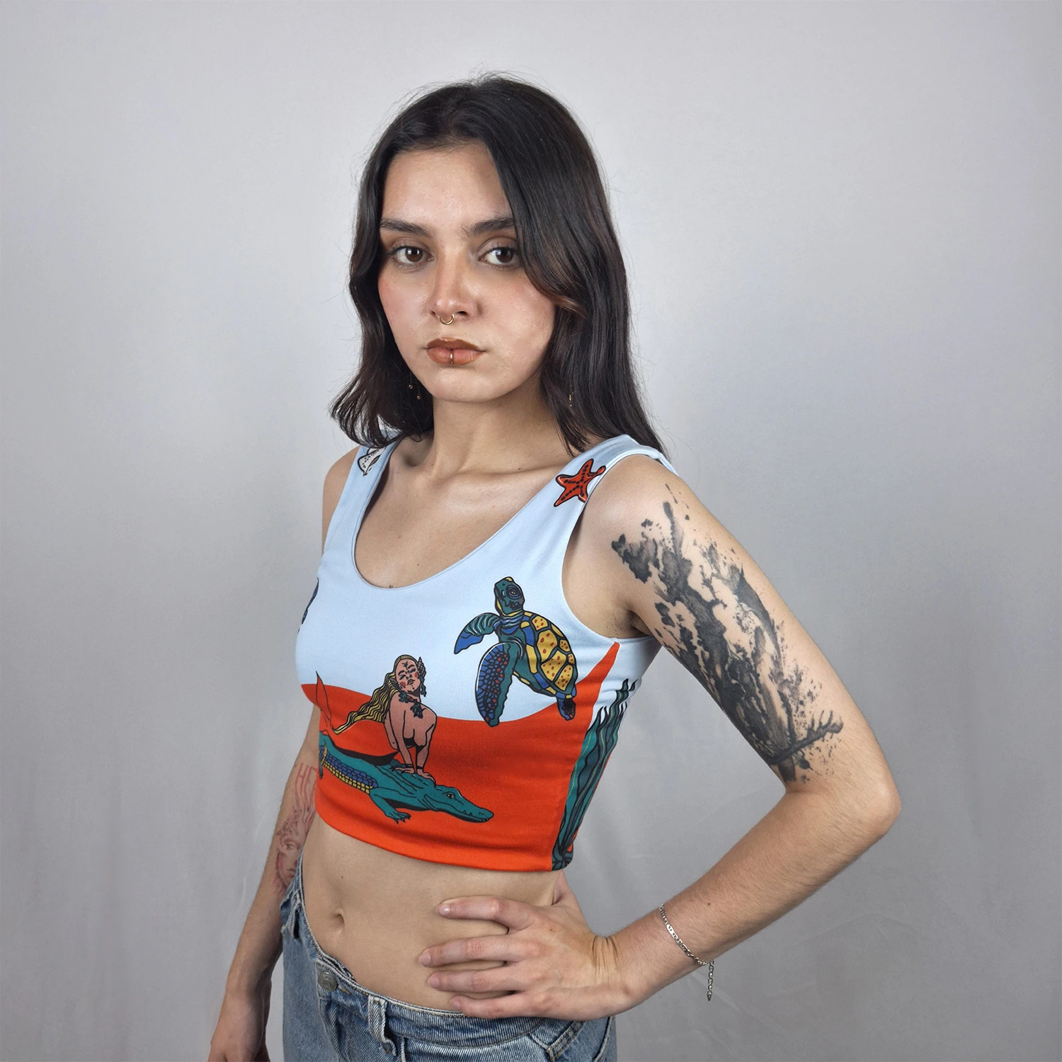 Este crop top eco doble faz está inspirado en el mito de la Madre Agua, una figura ancestral que representa el poder de los elementos y la vida. Por un lado, luce un diseño multicolor que evoca el fuego, la energía y la vitalidad; por el otro, un azul claro que transmite calma y conexión con el agua. Confeccionado por madres cabeza de hogar y diseñado por jóvenes creativos, está hecho con materiales sostenibles, fusionando estilo, identidad y conciencia ambiental en una sola prenda.