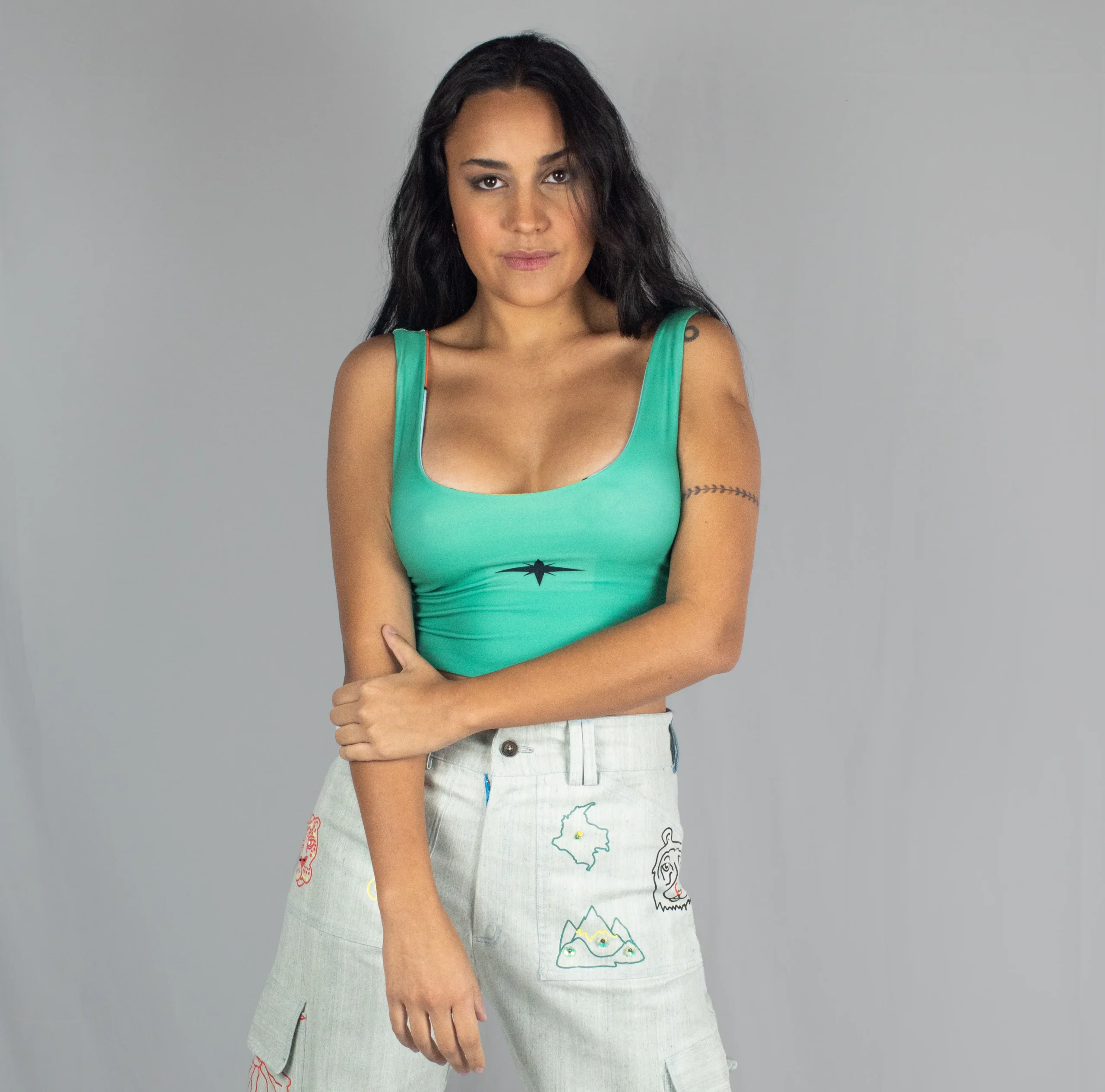 Crop top Montaña Sostenible Doble faz de Zipre. Talla única. Montaña/Azul o Montaña/Verde 50% Botellas PET recicladas (6 Botellas PET) Sublimación 0 % desperdicio de agua. Moda Sostenible.