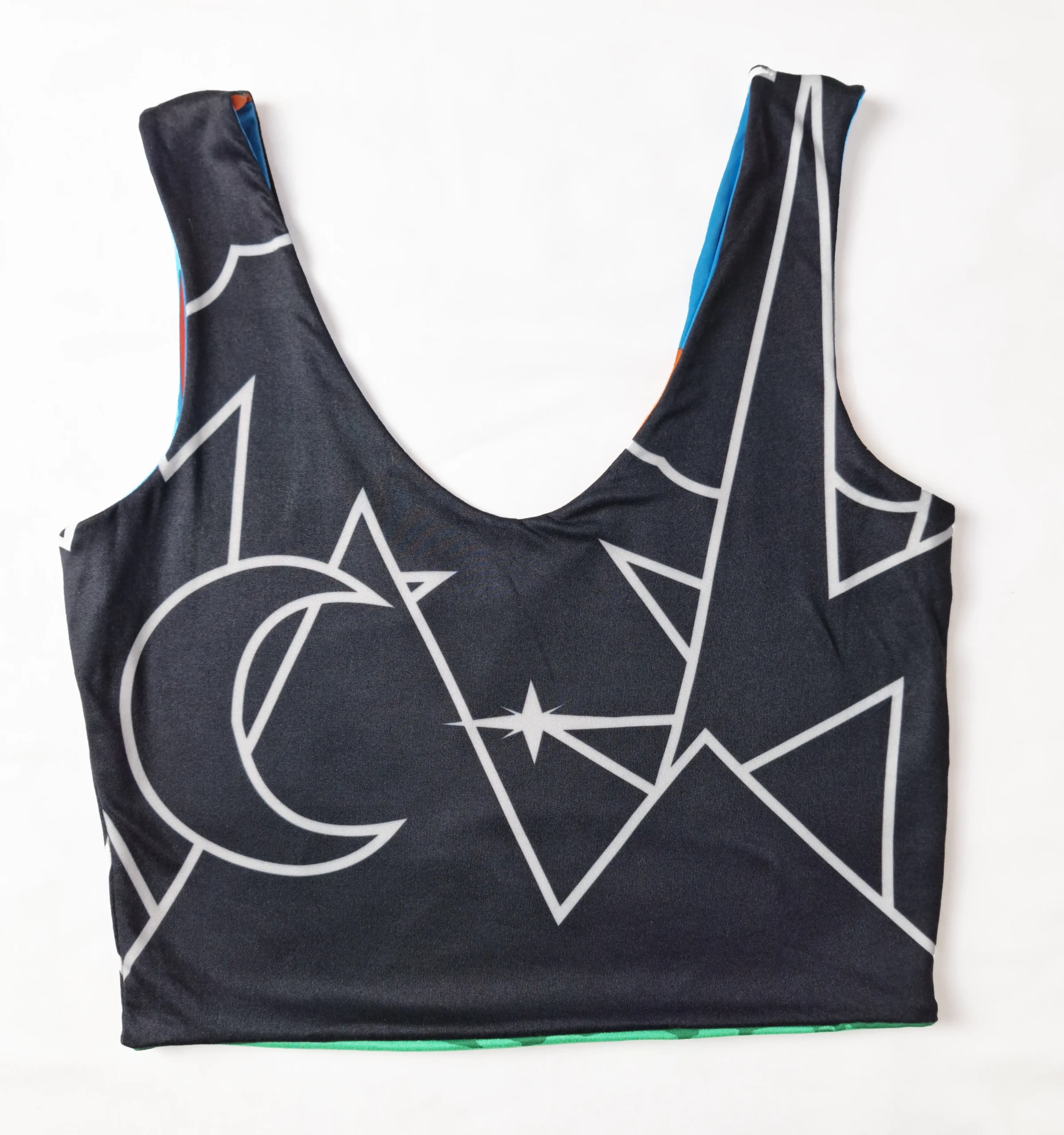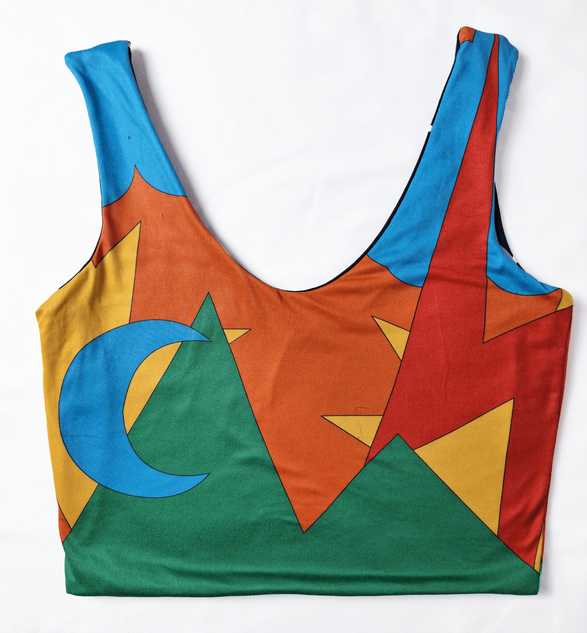 Este crop top sostenible doble faz es la prenda ideal para quienes buscan estilo y responsabilidad ambiental. Diseñado pensando en la versatilidad, tiene un lado colorido con figuras geométricas vibrantes y un reverso en blanco y negro, manteniendo el mismo patrón geométrico en ambas caras. Está confeccionado con tela reciclada de botellas PET: cada pieza transforma aproximadamente 6 botellas en un diseño único y eco amigable.