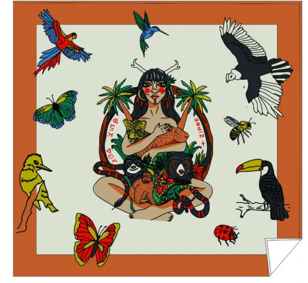 Esta pañoleta eMadre tierra forma parte de la colección Elemental y rinde homenaje al poder de la tierra, sus leyendas y la biodiversidad de Colombia. Su diseño representa la conexión con la Madre Tierra, ilustrando flora, fauna y mitos tradicionales que han pasado de generación en generación. 72cm x 72 cm